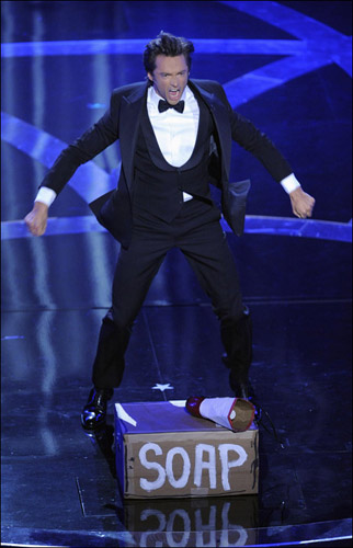 杰克曼最出彩的表現(xiàn)集中在與碧昂斯共舞的橋段。杰克曼與穿著性感的碧昂絲以及《媽媽咪呀》的主演阿曼達一起模仿《芝加哥》《紅磨坊》《發(fā)膠》以及《媽媽咪呀》等片的經典橋段,精彩的舞蹈表演將頒獎典禮的氣氛推向高潮。
