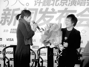 歌手許巍將于4月10日在北京工人體育館舉行個人演唱會——“今天”,這一消息昨日在京發(fā)布。好友——歌手葉蓓手捧鮮花抵達發(fā)布會現(xiàn)場道賀。