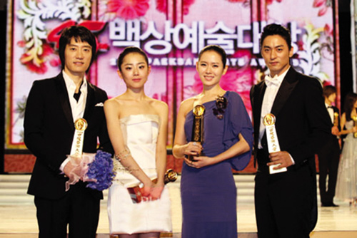 2月27日晚8時,韓國第45屆百想藝術(shù)大賞在首爾奧林匹克公園舉行。電影類獎項方面,朱鎮(zhèn)模憑《霜花店》奪最佳男主角獎,孫藝珍憑《妻子結(jié)婚了》當選最佳女主角,姜禹錫導(dǎo)演的《姜哲中:公共之敵1-1》獲電影大獎;電視劇類獎項方面,金明敏憑《貝多芬病毒》獲最佳男演員獎,文根英憑《風之畫院》獲最佳女演員獎,《媽媽長角了》獲電視類最佳作品獎和電視類大獎。去年的收視熱門劇《ON AIR》只由申宇哲獲得一個電視類最佳導(dǎo)演獎。電影類導(dǎo)演獎則由《精彩的一天》的李允基獲得。