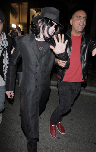 曾經(jīng)的天王,曾經(jīng)的巨星,曾經(jīng)的富豪樂(lè)壇最重量級(jí)天王邁克爾·杰克遜在宣布拍賣自己的收藏品后首次露面,在設(shè)計(jì)師Christian Audigier的陪同下外出購(gòu)物。天王不管走到哪里都有無(wú)數(shù)的狗仔隊(duì)跟蹤,當(dāng)天的邁克爾·杰克遜身穿黑色禮帽,黑色風(fēng)衣,黑色褲子黑色鞋子,帶黑色蛤蟆鏡,一身黑色更顯得容顏憔悴,皮膚蒼白,我們真的很懷念的那個(gè)曾經(jīng)的天王。