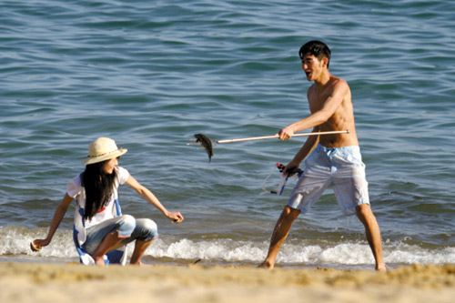 號(hào)稱“內(nèi)地版《流星花園》”的《流星雨》劇組昨天曝光了一組沙灘照,照片里是眾主演在廈門某酒店拍攝的一場(chǎng)海邊度假野炊的群戲。照片曝光后,張翰(飾慕容云海)捕魚上岸的“出浴”濕身照飽受網(wǎng)友詬病。在這組所謂的“性感劇照”中,不僅男主角沒有宣傳中的“壯碩的胸肌和紋路鮮明的腹肌”,其愣頭愣腦的神情和夸張的肢體語(yǔ)言更被不少網(wǎng)友戲稱為“少年閏土”和“黑土進(jìn)城”。相比之下,身邊的“草根”女主人公楚雨蕁倒更顯洋氣。