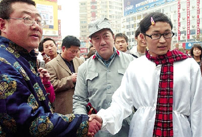 隨后,“小沈陽”、“李云龍”攜手漫步二七廣場,市民伴隨左右,越聚越多,致使二七廣場北側(cè)唯一的行車道一度堵車。接著,“范偉”也放下生意,和兩人一起走到南順城街!靶∩蜿枴闭f,他要帶“李云龍”去紫荊山公園等處轉(zhuǎn)轉(zhuǎn)。