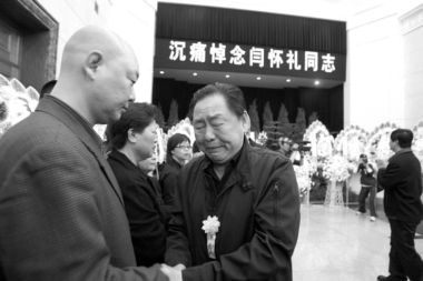 上午9時(shí)40分,遲重瑞、六小齡童和馬德華攜花圈來到現(xiàn)場(chǎng)。聚集在廣場(chǎng)上的影迷和記者立即將3人團(tuán)團(tuán)圍住!八研蕹山鹕砹_漢,并將永遠(yuǎn)留在喜愛他的觀眾心里!绷↓g童激動(dòng)地說。六小齡童表示,閆懷禮在天堂和他們心同在,他們是生死之交。同時(shí)他和馬德華也透露,電視劇《吳承恩與西游記》將在今年暑期播出,這也是閆懷禮生前最關(guān)注的一件事。此外,《西游記》中的幾個(gè)好兄弟也一直在策劃《西游記》主題公園和電影《大鬧天宮》,他們將盡快落實(shí),以告慰閆懷禮的在天之靈。