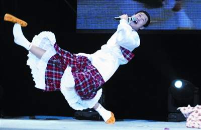 經(jīng)過近2小時的“溫場”后,小沈陽終于壓軸登臺亮相。一看到身穿標(biāo)志性的紅格子“蘇格蘭”服,背著小挎包的小沈陽從后臺走出來時,觀眾紛紛尖叫著起立。久候在舞臺邊的一群女粉絲手捧鮮花,欲沖過保安防線上前獻給偶像。“對我的粉絲要客氣哦!”小沈陽金口一開,粉絲們立即突破了防線沖上臺去,有女粉絲獻過花后再來一個熊抱,后面的女粉絲更是“搶吻”小沈陽,“陽仔(小沈陽小名)我愛你”的真情表白更在劇場內(nèi)此起彼伏,看來小沈陽的“女人緣”極好。