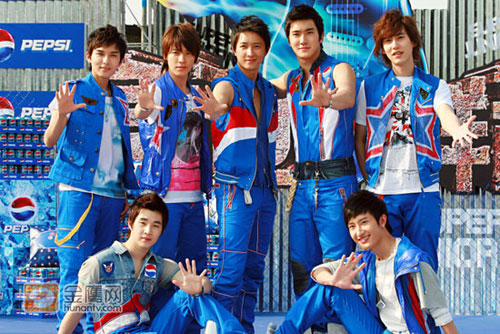 由中國成員韓庚領(lǐng)軍的超人氣男子組合Super junior-M出席某飲料簽約儀式,正式加入這個規(guī)模龐大的品牌家族。這支2008年4月在中國出道的韓國花美男組合目前已在中韓兩國都掛起了一陣颶風(fēng),這次發(fā)布會現(xiàn)場更是吸引了多達二百多位粉絲身著SJ的守護色寶藍色,早早在機場守候。大會安排了三十多名保安護駕護航,足以彰顯SJ-M的超高人氣。