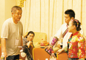 很少能看到趙本山和小沈陽同臺表演,這次海南之行的首場演出,恐怕也是“劉老根大舞臺笑轉(zhuǎn)2009”全國巡演中唯一一場本山師徒同臺的表演,因?yàn)橛^眾是參加博鰲論壇的國際政要和經(jīng)濟(jì)專家。在演出后臺,本山首先演練了一遍即將在舞臺上表演的“吹拉彈唱”,隨后就開始對自己的徒弟一一評點(diǎn)。別看徒弟們個個在舞臺上精神抖擻,但在面對如此大場面時不免有些緊張,紛紛對師父說出自己的顧慮。“別緊張,就當(dāng)是在咱們沈陽中街基地演了!”“你這個口我看可以使,沒關(guān)系,出了事我兜著。”“你中間的那一段就不要加了,不好,不文雅!泵鎸ν降,本山嚴(yán)肅認(rèn)真地對他們的表演提出要求。因?yàn)閷ν降艿谋硌莺徒^活爛熟于心,本山三言兩語就指出了他們的不足,并且提出了建議。有了他的點(diǎn)撥,徒弟們個個信心十足地走上了舞臺……