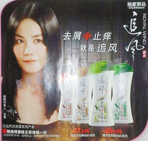 該網(wǎng)友上傳的照片中,王菲清湯掛面的造型與她特立獨行的性格相當(dāng)不符,而天后似笑非笑的表情,也并不討好消費者。當(dāng)然,與王菲頭像并列的“追風(fēng)”牌洗發(fā)水,更被網(wǎng)友大批好似山寨貨,該品牌洗發(fā)水打出的功效是“去屑止癢”,并在海報上注明凡是購買產(chǎn)品寄送王菲海報一張,全國限量3萬張。