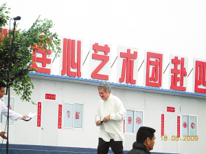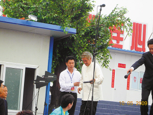 雖然本次“心連心”藝術(shù)團在明星陣容上創(chuàng)下了空前的紀(jì)錄,但是劇組在籌備過程中卻是對成本極盡節(jié)約。昨日早上6點半,記者提前來到演出現(xiàn)場,碩大一個舞臺就搭建在板房區(qū)的一個空地上,舞臺背景也是就地取材,由幾間貼著大紅對聯(lián)的板房組成,但看著特別的溫暖。