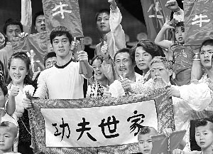 一部《李小龍傳奇》讓陳國(guó)坤成為2008年人氣最旺的演員之一,由他參演的滑稽舞蹈《功夫世家》也是昨天彩排中人氣最高的節(jié)目,雖然以李小龍裝扮出現(xiàn)的陳國(guó)坤表演“雙截棍”的時(shí)候,觀(guān)眾席上前排一位一直在玩游戲機(jī)的小男孩也看得拍起手來(lái)!豆Ψ蚴兰摇返娘L(fēng)格相當(dāng)搞笑,演員們有的穿著睡衣,拿著飯鍋、菜板等道具,在一起“比武”。節(jié)目里面的人物很多“借鑒”自周星馳的電影作品,造型怪異,但卻個(gè)個(gè)功夫高強(qiáng),甚至《功夫》里的戴著“燙發(fā)卷”的“包租婆”也出場(chǎng)“搞笑”了。陳國(guó)坤在《功夫世家》中最后亮相,他除了表演雙截棍外,還要用拳和腿分別擊開(kāi)兩塊木板。雖然是以舞蹈節(jié)目的形式出現(xiàn),《功夫世家》在現(xiàn)場(chǎng)贏(yíng)得的笑聲并不比演員類(lèi)節(jié)目少。