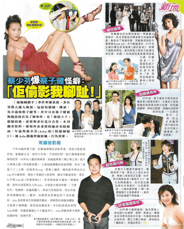 今年39歲的蔡子健,進入演藝圈之前曾當過救生員、福利工作者、平面設計師、旅行團領隊和保險經(jīng)紀等,1993年加入無線藝員訓練班,拍完情景劇《開心華之里》后不久便被調去主持《閃電傳真機》節(jié)目,之后拍過無數(shù)旅游特輯,故有“旅游王子”之稱。因經(jīng)常出差,他愛上攝影。據(jù)資料顯示,2001年,蔡子健與蔡少芬合拍《陀槍師姐3》時,兩人演夫妻拍一場婚紗戲。當時蔡少芬不經(jīng)意地大爆蔡子健的怪癖:“子健人不錯,很懂得照顧人,還整天幫我照相,有一次還偷拍我的腳趾!”據(jù)知,拍劇時,蔡少芬經(jīng)常貪舒服穿著拖鞋到處走,其修長的美腿和腳趾引起蔡子健的興趣,所以拍下來作收藏。近日,記者就此事詢問蔡少芬,但據(jù)悉無線已下令藝員“封口”,蔡少芬對關于蔡子健的問題立即裝聾扮啞,拒絕作答。
