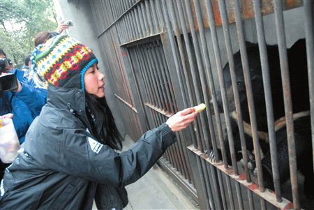 莫文蔚2004年3月成為亞洲動物基金“拯救黑熊愛心大使”,隨后,只要她到成都,一定要抽出時間前往黑熊救護(hù)中心。這次來成都參與震后的公益慈善活動,莫文蔚昨日一大早就來到了救護(hù)中心。“寶貝兒”是2005年初莫文蔚認(rèn)養(yǎng)的一只取膽黑熊,經(jīng)過工作人員4年的精心照料,“寶貝”早已康復(fù)。當(dāng)莫文蔚來到“寶貝”的喂養(yǎng)間時,“寶貝”似乎認(rèn)識恩人,一看到莫文蔚就活蹦亂跳。莫文蔚也開心不已,還把特意帶來的水果蘸上蜂蜜喂給“寶貝”(上圖)。昨日莫文蔚還看望了最新救助的12頭黑熊以及棕熊“凱撒”,一路上笑聲不斷。