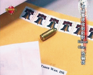 前晚,香港有線電視收到一封寄自美國(guó)的恐嚇信,內(nèi)里除一粒子彈外,還附有一封針對(duì)陳冠希的恐嚇信件,警告他自4月4日后不要再出席任何公開(kāi)活動(dòng),否則將危害其人身安全。昨天,陳冠希的老板林建岳接受記者采訪時(shí)表示,不會(huì)擔(dān)心陳冠希的安危。陳冠希自己也不懼“子彈”,將出席《神槍手》4月在新加坡的首映禮。