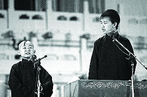 昨晚演出前大會堂門口的黃牛黨多數(shù)都在收票,演出開場后原價票依然還有人肯買。演出舞臺裝飾成天壇的樣子,讓北京觀眾感到相當親切。郭德綱兒子郭麒麟和義子陶陽開場就說了《學雜唱》,這個段子主要表現(xiàn)演員對各種戲曲唱段掌握程度,比相聲臺高一點點的郭麒麟不僅將梅葆玖、袁世海等名角唱腔模仿得很像,而且現(xiàn)場還唱起了流行歌曲,此外口才也相當了得,不少觀眾感嘆“還是有郭德綱的遺傳基因,天賦不俗。”