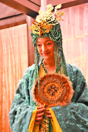 周迅說,她在《孔子》中和周潤發(fā)只有一場戲。雖然戲份少,但華服卻讓她大開眼界!拔抑荒苡镁聛硇稳葸@件衣服,紗裙是孔雀羽毛做成的;頭飾都是由一顆顆的小石頭串起來的,差不多有10斤重,時間長了我的脖子都承受不了,還得有人幫忙扶著!
