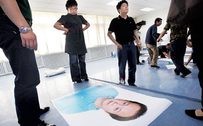 上午10時許,大廳入口處已經擺開一排長桌,工作人員正對著筆記本挑選羅京的相片,仔細確認相片的尺寸后,交代人員去打印以備布置靈堂之用。