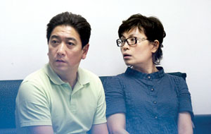 上午,李瑞英戴著黑框眼鏡出現在靈堂現場,表情凝重地看著有關羅京后事的稿件。