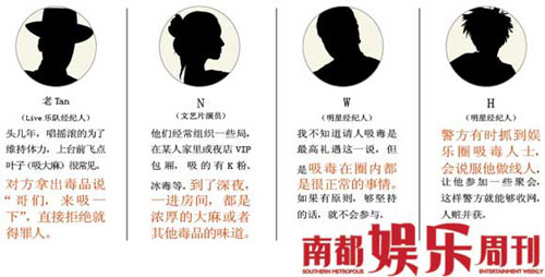 一個(gè)手底下帶著以曲藝形式包裝的Live樂隊(duì)的經(jīng)紀(jì)人老Tan對(duì)本報(bào)記者透露,自己也曾遇到過這種情況,對(duì)方拿出毒品說“哥們,來吸一下”,這個(gè)時(shí)候,如果你不夠圓滑,直接拒絕就可能得罪對(duì)方。“如果我走進(jìn)包房,聞到有什么異樣的味道,我就會(huì)待一會(huì)兒,趕緊走。如果真躲不過被對(duì)方問到,我也會(huì)找個(gè)理由,比如上廁所或者其他什么的,溜掉?隙ú荒茏寣(duì)方覺得我不把他當(dāng)哥們。當(dāng)然,這也是一時(shí)之計(jì),時(shí)間長(zhǎng)了,人家也知道你不好這口,干脆就不帶你玩兒了。” 也有某經(jīng)紀(jì)人W說:“我不知道請(qǐng)人吸毒是最高禮遇這一說,但是吸毒在圈內(nèi)都是很正常的事情。如果有原則,夠堅(jiān)持的話,就不會(huì)參與。我看見有人吸,也會(huì)勸勸對(duì)方別沾這個(gè)。不過圈內(nèi)最正常的玩法還是喝酒和泡妞。”