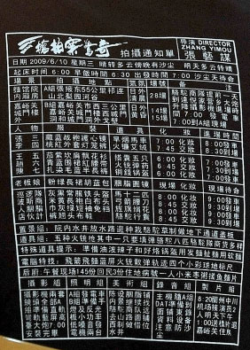 記者從這份泄密的拍攝通知單上發(fā)現(xiàn):今天拍攝的將主要是張三(孫紅雷)和李四(小沈陽)之間的對手戲,其余人物還有王五、趙六以及陳七、老板娘、巡邏隊、波斯商、人胭脂、店伙計。拍攝道具則包括旱煙、馬車、火鐮、搭囊、火筒彈藥、弓箭、腰刀等,另有駱駝以及馬12匹?磥斫裉炫臄z的大部分都是外景。有意思的是,這張拍攝通知單上還有一條“特殊道具提示”:油潑辣子、烙鍋盔用發(fā)面,扯面用軟面。而午餐現(xiàn)場是145份,說明這個劇組規(guī)模還是不小。細(xì)心的工作人員還注明:“住地病號一人:小米棗粥搓魚面片!笨磥碇八鶄鲃〗M伙食不錯的消息果然不假。