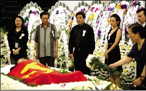 羅京的靈柩上覆蓋著黨旗,被抬入殯儀館的途中,人群中不時有人輕聲送別,“羅京一路走好”“羅京我愛你”,聽了讓人動容。
