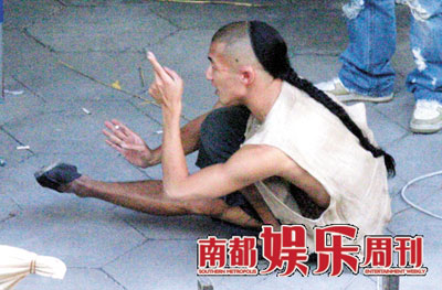 謝霆鋒在片中是一個拉黃包車的“車夫”,“六義士”之一。他在片場表現(xiàn)極其活躍,不僅主動找人“挑戰(zhàn)”,還積極練功,一絲也不懈怠。自從結(jié)婚生孩子后,謝霆鋒就自作主張轉(zhuǎn)型成“動作演員”了,每部戲就力求從頭打到尾。動作戲,時間短,片酬高,誰都愛接(詳情請參閱本期重點)。問題是謝霆鋒原本是個摔吉他的,現(xiàn)在換了要打架摔跤,基礎(chǔ)略有些薄弱。為此謝霆鋒一直孜孜不倦,努力學(xué)習(xí),在片場看見熟悉的武行就要和對方“套招”,大家都不理他了,他還一個人玩起撐地踢腿。通過努力鍛煉,謝霆鋒的功夫的確見長。