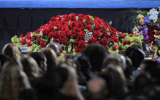 至此,追思會(huì)完美落幕,靜躺在舞臺(tái)中央的杰克遜靈柩,被鮮花簇?fù)碇,靜靜抬離現(xiàn)場(chǎng),出現(xiàn)在大幕上的鏡頭是這位天王最后一次的彩排畫面,深色褲子與西服,紅色襯衣,動(dòng)作嫻熟而精湛,風(fēng)采絲毫不減當(dāng)年,斯人如舊。
