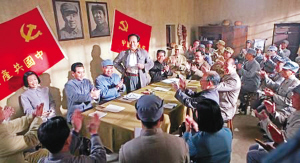 導(dǎo)演兼主演的唐國強信心十足地說:“最近《解放》被拿來和《建國大業(yè)》相比,但是我覺得《建國大業(yè)》沒法和我們比!碑斢浾咛峒啊督▏髽I(yè)》里明星多時,唐國強說:“他們有的,我們也有!我們這部劇匯集了劉勁(飾周恩來)、王伍福(飾朱德)、郭連文(飾劉少奇)、姚居德(飾彭德懷)、張再新(飾劉伯承)、馬曉偉(飾蔣介石)、于小慧(飾宋美齡)……”唐國強強調(diào)說:“他們有172個明星,我們有473個歷史人物,數(shù)量和分量上可都不差哦!”