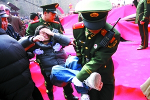 開(kāi)機(jī)大典在一片鑼鼓和禮炮聲中拉開(kāi)序幕。當(dāng)?shù)氐臄?shù)千名圍觀群眾剛開(kāi)始還秩序井然,多數(shù)在遠(yuǎn)處旁觀。但是,隨著眾主創(chuàng)的陸續(xù)登臺(tái)亮相,人群中開(kāi)始騷動(dòng)起來(lái)。盡管現(xiàn)場(chǎng)有人數(shù)頗多的保安維持秩序,但是都保護(hù)著明星和領(lǐng)導(dǎo),并沒(méi)有安排專(zhuān)人負(fù)責(zé)媒體席,令300多位群眾瞬間涌上原本只能容納百人的一米多高的簡(jiǎn)易媒體臺(tái)。