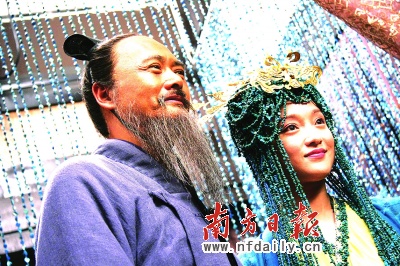 昨天下午5時左右,在涿州影視城戰(zhàn)國城內(nèi)的一座大殿里,“子見南子”的戲正式上演。幽暗的大廳里擺設著8座戰(zhàn)國時常見的犧尊造型的琉璃紗燈,褐色的紗帳從梁上垂下。而由奚仲文打造的演員服裝更是讓人眼前一亮:扮演孔子的周潤發(fā)身穿青灰色麻布長袍,頭戴同顏色的儒士巾,看起來極為樸實。而周迅扮演的南子則一身水藍色的長裙,顯得雍容華貴。周迅頭頂?shù)慕鹕P冠和同樣水藍色的頭飾,據(jù)說是由松綠石串成,因此非常沉重。在第一次試戴的時候,周迅甚至抬不起頭來, 需要有人在后面幫忙才能正常行走。