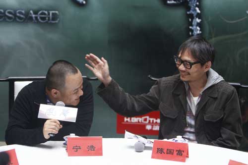 中新網(wǎng)10月14日電 “《風(fēng)聲》令我很有壓力?此那叭种矣X得結(jié)尾很難收,但最后收的非常帥!苯,獲得超高口碑及票房的華語諜戰(zhàn)巨制《風(fēng)聲》在京舉行了“兩代類型片導(dǎo)演”懇談會,正在拍攝《無人區(qū)》的新一代類型片領(lǐng)軍人物寧浩特意趕來,與《風(fēng)聲》導(dǎo)演陳國富對談。