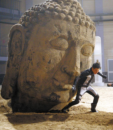 在《未來警察》中,劉德華化身為正義的未來警察,跟大S、范冰冰、徐嬌、樊少皇、賀軍翔共同上演了一出時(shí)空穿梭、正邪激戰(zhàn)的火爆好戲。片中有一幕,拍的是劉德華站在一尊兩米高的石佛之下,與樊少皇率領(lǐng)的改造人團(tuán)伙激烈打斗。據(jù)了解,一貫追求完美的劉德華當(dāng)時(shí)堅(jiān)持不用替身,結(jié)果意外發(fā)生了。雖然已事先備下保護(hù)措施,但在推動(dòng)佛像的過程中,這座千余斤的巨物卻突然失控,將劉德華壓在下面,F(xiàn)場工作人員大驚失色,一擁而上解救他,但畫面也因此穿幫。 (李麗)