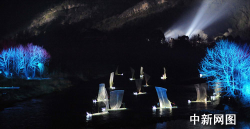 24日晚首次試演的《印象·大紅袍》實景舞臺上,在武夷山間,創(chuàng)造出180度、2公里長、15塊屏幕連動的實景立體電影,白馬一忽兒現(xiàn)身,一忽兒隱身樹林或山間,一忽兒奔騰于山那頭;仙鶴則從觀眾眼前翩翩飛走……