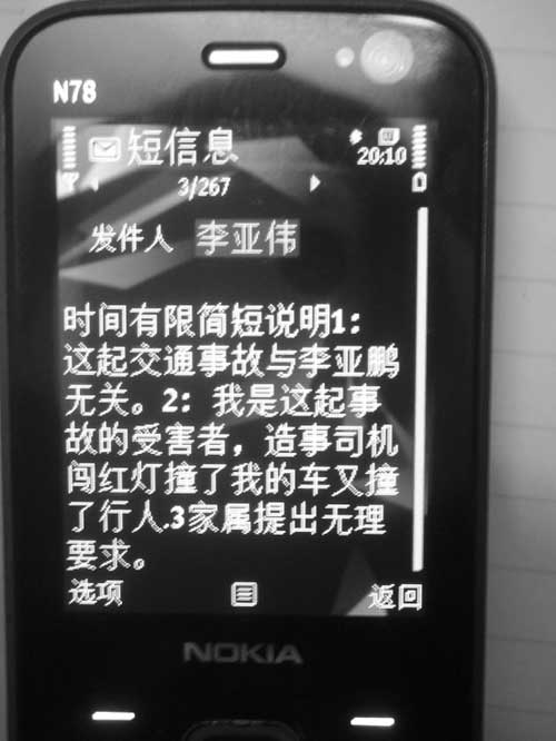 昨天,李亞偉接受了本報(bào)記者的采訪,針對(duì)“車禍門”事件,他給記者發(fā)來短信表明態(tài)度——1:這起交通事故與李亞鵬無關(guān)。2:我是這起事故的受害者,造事(應(yīng)為肇事)司機(jī)闖紅燈撞了我的車又撞了行人。3:家屬提出無理要求。