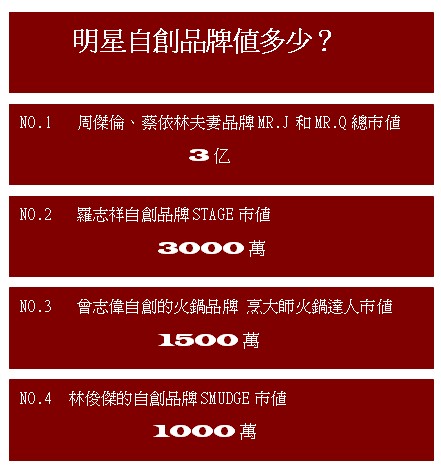 而針對(duì)這種明星以自己名義創(chuàng)立品牌的現(xiàn)象,究竟明星們的品牌價(jià)值值多少?為此記者特意采訪了知名品牌管理學(xué)者的楊教授,據(jù)楊教授解釋:由于藝人本身具有較高的社會(huì)知名度和形象的度,因此藝人創(chuàng)意品牌的價(jià)值起點(diǎn)都會(huì)比普通人高出好幾倍,因此藝人的知名度和形象度與其創(chuàng)立的品牌價(jià)值是密切相關(guān),從某種意義上成正比關(guān)系,而對(duì)娛樂圈的一些藝人及其自創(chuàng)品牌,楊教授也給出一個(gè)系統(tǒng)的市值評(píng)估,如羅志祥的自創(chuàng)品牌STAGE市值 3000萬,林俊杰的自創(chuàng)品牌SMUDGE市值1000萬,曾志偉自創(chuàng)的火鍋品牌烹大師火鍋達(dá)人市值1500萬,而周杰倫與蔡依林這次合伙經(jīng)營的MR.J和MR.Q市值,楊教授也給出了一個(gè)值得參考的數(shù)據(jù)3億。