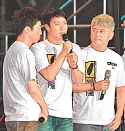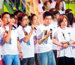 昨晚會(huì),劉德華從頭到晚穿梭在舞臺(tái)上,先與鄭秀文合唱〈喝采〉,再與任賢齊演唱臺(tái)語(yǔ)歌〈天下第一等〉鼓勵(lì)臺(tái)灣,稍晚也與譚詠麟、陳百祥、溫拿五虎演唱〈朋友〉,日前他自費(fèi)來(lái)臺(tái)賑災(zāi),連趕兩臺(tái),回港后又與曾志偉合辦“88水災(zāi)關(guān)愛行動(dòng)”,為臺(tái)灣出錢出力。
