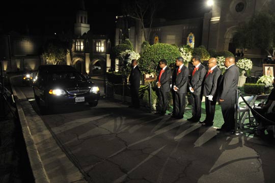 臺(tái)灣TVBS消息,白色的鮮花將杰克遜的葬禮布置得莊嚴(yán)素雅,棺木旁還有一幅杰克遜的畫像。包括玉婆伊麗莎白.泰勒,還有麥考利.金都紛紛出席,要送杰克遜最后一程,但是杰克遜的家人卻延遲了1個(gè)多小時(shí)才出現(xiàn),也讓原本要在北京時(shí)間10點(diǎn)舉行的葬禮,一直到11點(diǎn)才開始。