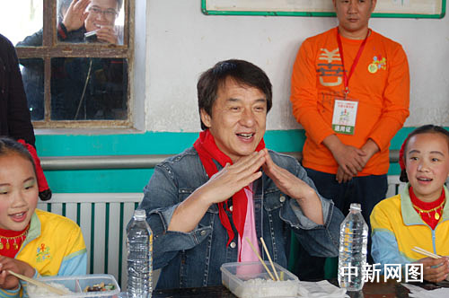 臨近午飯時(shí)分,成龍與十幾名小學(xué)童每人領(lǐng)到了一盒香菇炒油菜和白米飯的盒飯,在一間簡(jiǎn)陋的教室里津津有味地吃了起來(lái)。雖然是頭一次與國(guó)際巨星成龍?jiān)谝黄鸪燥,可這些鄉(xiāng)村娃娃卻一點(diǎn)也不怯場(chǎng),好奇心驅(qū)使他們左一個(gè)問(wèn)題右一個(gè)問(wèn)題問(wèn)個(gè)不完。而成龍卻面帶笑容地邊吃邊聊,將他的成長(zhǎng)經(jīng)歷和成功經(jīng)驗(yàn)?zāi)托牡匾灰唤獯。眾學(xué)童聽(tīng)完后,紛紛夸“成龍叔叔好棒!”