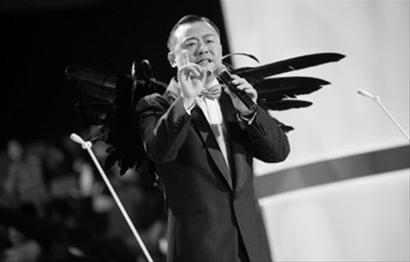 當(dāng)晚,周立波一身筆挺修身的黑西裝在舞臺上亮相,只不過背后“長”出了一雙黑色的羽毛翅膀,最搞笑的是,他居然提了個小板凳,然后直挺挺地站了上去,因為他周圍的美女個頭都比他高!拔医裉斓脑煨推鋵嵤莻天使,但很多人說我像只烏鴉,但你們別把烏鴉不當(dāng)鳥,別把饅頭不當(dāng)點心!”