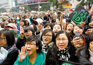 本報訊 山城昨日陰雨綿綿,不過這絲毫沒有影響到周筆暢的人氣。從中午開始,觀音橋茂業(yè)百貨外的簽售現(xiàn)場就聚攏起了四面八方趕來的筆迷,F(xiàn)場足有近二千人,超過上一次古天樂在同一地點簽售時的狀況。