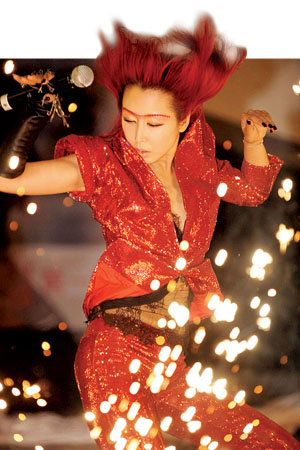 火紅的頭發(fā)、紅色亮片裝以及酷似LadyGaga(以勁爆造型聞名的美國流行音樂新晉 “舞后”)造型的激光太空鏡……歌手孫悅昨日在京發(fā)行新專輯 《變》,造型大變身。