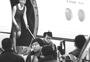 下午3:20,成龍的飛機(jī)降落在機(jī)場(chǎng)。幾名工作人員先行下機(jī),警覺地四處環(huán)顧,一眼就看到了攝影記者手中的相機(jī),立刻上前阻止:“成龍大哥沒有化妝,頭發(fā)很亂,還有白頭發(fā),你不能拍!