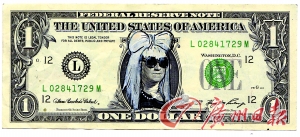 Lady gaga可謂紅得發(fā)紫,日前,美國(guó)畫家克里斯·格里森將印有美國(guó)第1任總統(tǒng)喬治·華盛頓頭像的1美元鈔票,篡改成Lady gaga的經(jīng)典造型。
