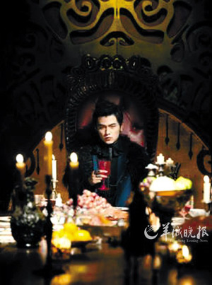 在新專輯預(yù)售海報上,周杰倫以一個中古世紀的吸血鬼扮相出現(xiàn)。只見他臉色蒼白,嘴唇鮮紅,穿一身西裝外套,還罩了一件羽毛披肩,坐在餐桌前若有所思,像是一個住在城堡中的神秘“吸血鬼王子”。造型師還在周杰倫的指甲貼上帶有鉚釘?shù)闹讣灼,讓握著酒杯的手流露出華麗感;眼睛里則戴上了特殊的隱形眼鏡,營造出一雙“電眼”,眼里還有動物般的直立橢圓瞳孔,詭異得令人戰(zhàn)栗。