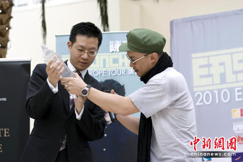 在接收旅英福建籍僑領、大本鐘獎組委會主任李俊辰授予的證書和獎座時,陳奕迅表示非常高興可以參與并獲得這項和全球華人青年相關的重要獎項。