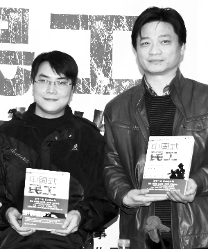 “周述恒指望《中國(guó)式民工》的稿酬回家蓋樓,主要就是看沈先生了”。央視著名主持人崔永元邊說(shuō)邊把話(huà)筒遞給了外交部前新聞發(fā)言人、世界知識(shí)出版社總編輯沈國(guó)放。沈國(guó)放說(shuō),“希望大家都來(lái)關(guān)注這本書(shū),關(guān)注農(nóng)民工!4月6日下午,四川籍民工周述恒的《中國(guó)式民工》一書(shū)的首發(fā)式在王府井書(shū)店舉行。