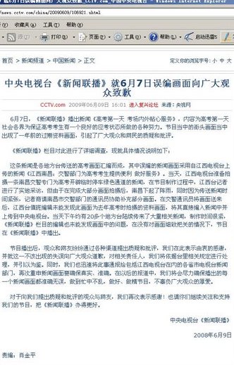 2天后的6月9日,央視在官方網(wǎng)站首頁的顯要位置,發(fā)表“中央電視臺‘新聞聯(lián)播’就6月7日誤編畫面向廣大觀眾致歉”的消息。