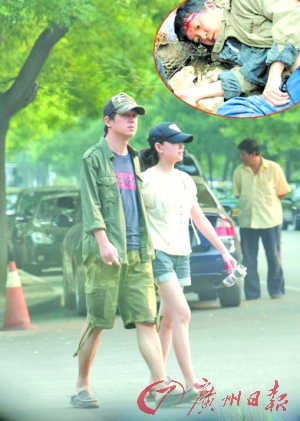 為了不讓外人認(rèn)出,潘粵明與董潔都將帽檐壓得很低,兩人十分悠閑地邊走邊聊。從行走狀態(tài)上看,潘粵明已能行走自如,只是步履比較緩慢,董潔顯得比較緊張,還不時(shí)看看潘粵明臉上是否有不適的感覺(jué)。當(dāng)天董潔的左手中握著一卷褐色的物品,很像是醫(yī)用繃帶之類(lèi)的東西,看樣子是為潘粵明準(zhǔn)備的。