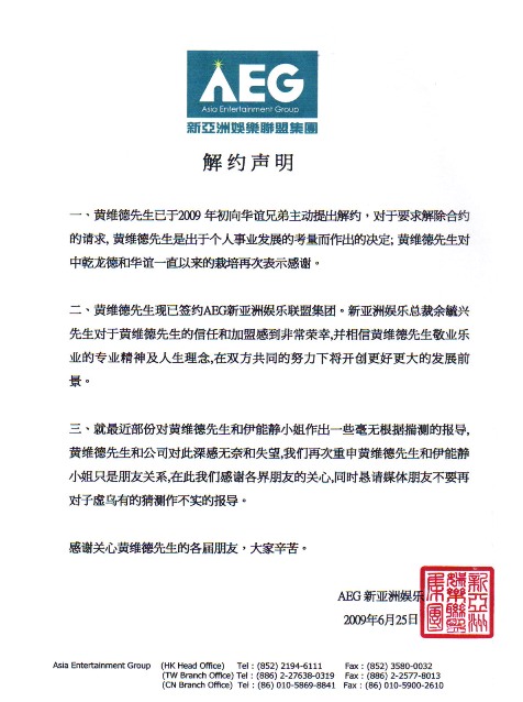 AEG新亞洲娛樂聯(lián)盟集團(tuán)的聲明指,黃維德先生已于2009 年初向華誼兄弟主動(dòng)提出解約,對(duì)于要求解除合約的請(qǐng)求, 黃維德先生是出于個(gè)人事業(yè)發(fā)展的考慮而作出的決定。