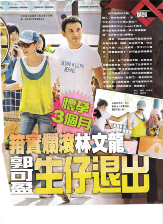 據(jù)昨日香港雜志報(bào)道,郭可盈與林文龍今年卷入“桃色勒索案”,5月30日,他們手牽手舉行澄清記者會后,郭可盈的情緒一直未能平復(fù),終日提心吊膽。為了讓林文龍“老實(shí)”,之前一直不愿意生孩子的郭可盈終于懷孕,目前,她已有三個月身孕,林文龍終于收心。為了全天候看著老公,郭可盈下決心退出娛樂圈,因此下個月將播出的《富貴門》會是她的告別作。為了減輕負(fù)擔(dān),郭可盈將月供十幾萬元的房子快速售出。