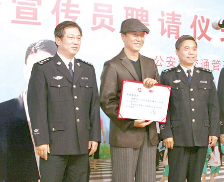 在熱播電視劇《潛伏》中成功扮演地下黨員余則成的影視明星孫紅雷,今日又多了一個(gè)身份———交通安全宣傳員。今天上午11點(diǎn)半,孫紅雷在眾多媒體“咔咔”作響的鎂光燈下,從公安部交通管理局局長(zhǎng)楊鈞手里接過(guò)大紅的“交通安全宣傳員”證書(shū),正式成為公安部交通管理局聘請(qǐng)的首位交通安全公益宣傳明星。