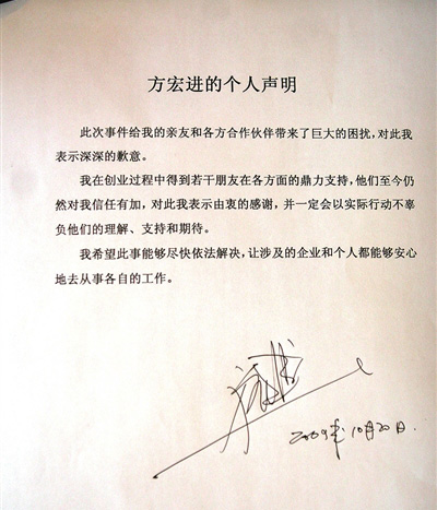 方宏進(jìn)的聲明字?jǐn)?shù)并不多,全文為打印字體,在文末空白處,方宏進(jìn)簽上了自己的名字。一開頭,方宏進(jìn)就道歉,“此次事件給我的親友和各方合作伙伴帶來了巨大的困擾,對(duì)此我表示深深的歉意!憋柺軤(zhēng)議的方宏進(jìn)直言:“希望此事能夠盡快依法解決,讓涉及的企業(yè)和個(gè)人都能夠安心地從事各自的工作。”